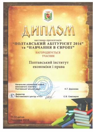 11-12 квітня колектив Полтавського інституту економіки і права взяв участь у щорічній міжрегіональній виставці-презентації «Полтавський абітурієнт – 2016», яка проходила у приміщенні Полтавської обласної універсальної наукової бібліотеки імені І.П. Котляревського. Цей культурно-інформаційний захід став традиційним ярмарком знань для учнів і сприяв обміну досвідом між освітянами.