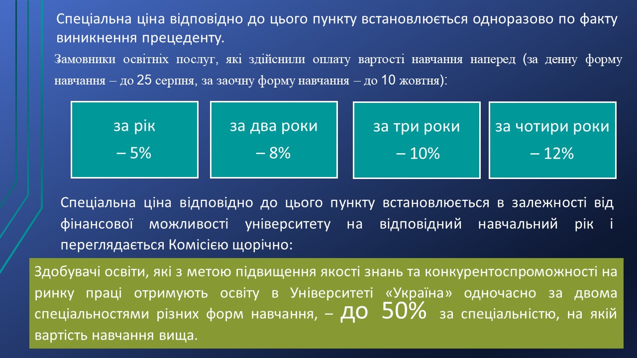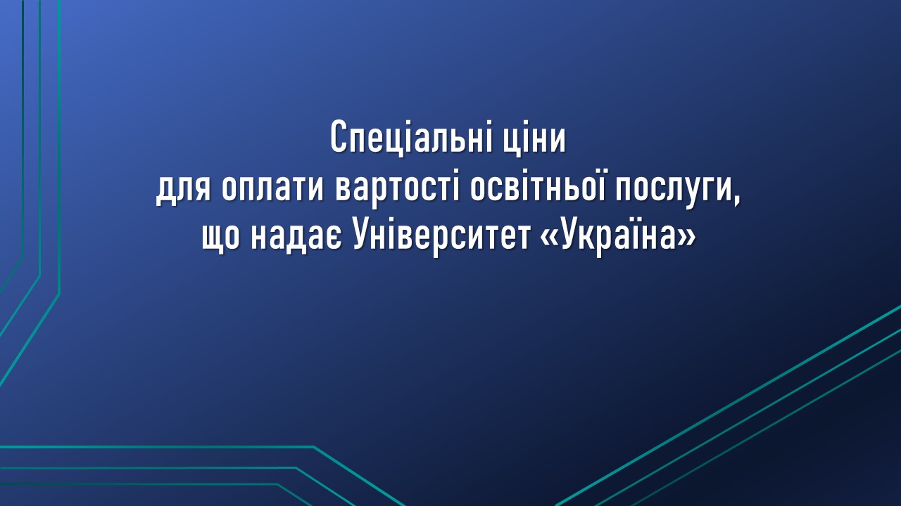 Система ціноутворення в Університеті "Україна" як соціально орієнтованого ЗВО базується на розрахунку собівартості освітніх послуг і супутніх продуктів, враховує платоспроможність населення у регіонах, залежить від напряму підготовки / спеціальності та форми навчання. Загалом ціни нижчі за середні на ринку освітніх послуг. Діє гнучка система знижок, що виконує соціальну і мотиваційну функцію.